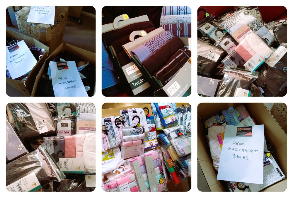 This year we decided to collect for a Spring Appeal – Smalls for All, and as usual we have had an amazing response. You have donated a total of 861 items of underwear, which included 97 Bras, 476 pairs of ladies’ pants, 15 pairs of men’s boxers and 273 pairs of children’s pants. We would like to send special thanks to John Graham from our Coda Community Choir who very kindly paid for and arranged shipping to send them to the charity in Scotland. We have been in touch with Smalls for All and they are so grateful and will send an acknowledgement once they have received the parcels.
